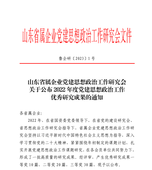 水發(fā)能源榮獲2022年度山東省屬企業(yè)黨建思想政治工作優(yōu)秀研究成果三等獎(jiǎng)
