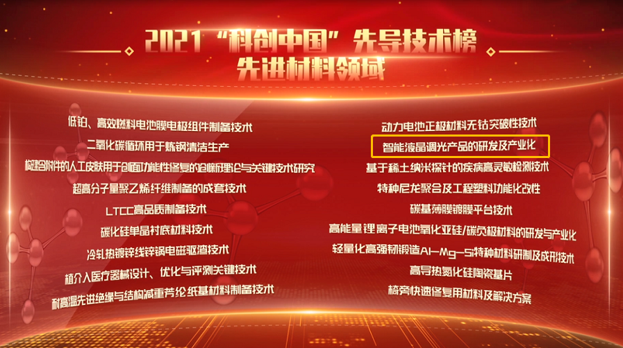 近日,2021年“科創(chuàng)中國(guó)”先導(dǎo)技術(shù)榜單結(jié)果公示,共遴選出100項(xiàng)具有開(kāi)創(chuàng)、突破意義,可轉(zhuǎn)移、轉(zhuǎn)化、交易的先導(dǎo)技術(shù)成果。由中國(guó)興業(yè)新材料控股有限公司選送的“智能液晶調(diào)光產(chǎn)品的研發(fā)及產(chǎn)業(yè)化”榮登榜單。