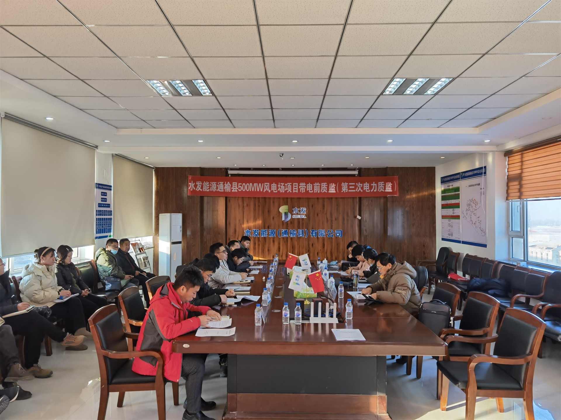 12月23日,可再生能源發(fā)電工程質(zhì)量監(jiān)督站專家組蒞臨水發(fā)能源通榆縣500MW風(fēng)電場項目,開展升壓站受電暨首批風(fēng)電機(jī)組啟動試運前質(zhì)量監(jiān)督檢查工作。水發(fā)能源通榆公司、設(shè)計單位、監(jiān)理單位、總包單位及各施工單位積極配合檢查。