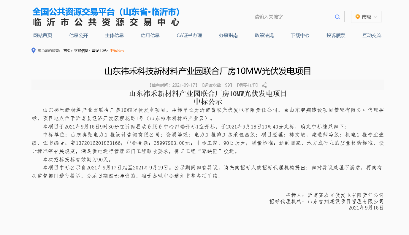 水發(fā)奧翔設(shè)計(jì)公司成功中標(biāo)山東祎禾新材料產(chǎn)業(yè)園10MW光伏發(fā)電EPC項(xiàng)目