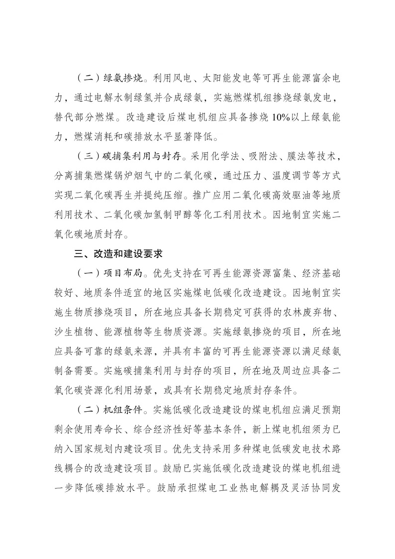 其中指出:利用風(fēng)電、太陽能發(fā)電等可再生能源富余電力,通過電解水制綠氫并合成綠氨,實施燃煤機(jī)組摻燒綠氨發(fā)電,替代部分燃煤。改造建設(shè)后煤電機(jī)組應(yīng)具備摻燒10%以上綠氨能力,燃煤消耗和碳排放水平顯著降低。二、改造和建設(shè)方式(二)綠氨摻燒。利用風(fēng)電、太陽能發(fā)電等可再生能源富余電力,通過電解水制綠氫并合成綠氨,實施燃煤機(jī)組摻燒綠氨發(fā)電,替代部分燃煤。改造建設(shè)后煤電機(jī)組應(yīng)具備摻燒10%以上綠氨能力,燃煤消耗和碳排放水平顯著降低。(三)碳捕集利用與封存。采用化學(xué)法、吸附法、膜法等技術(shù),分離捕集燃煤鍋爐煙氣中的二氧化碳,通過壓力、溫度調(diào)節(jié)等方式實現(xiàn)二氧化碳再生并提純壓縮。推廣應(yīng)用二氧化碳高效驅(qū)油等地質(zhì)利用技術(shù)、二氧化碳加氫制甲醇等化工利用技術(shù)。因地制宜實施二氧化碳地質(zhì)封存。三、改造和建設(shè)要求(一)項目布局實施綠氨摻燒的項目,所在地應(yīng)具備可靠的綠氨來源,并具有豐富的可再生能源資源以滿足綠氨制備需要。實施碳捕集利用與封存的項目,所在地及周邊應(yīng)具備二氧化碳資源化利用場景,或具有長期穩(wěn)定地質(zhì)封存條件。(二)機(jī)組條件。鼓勵承擔(dān)煤電工業(yè)熱電解耦及靈活協(xié)同發(fā)電、煤電安全高效深度調(diào)峰等技術(shù)攻關(guān)任務(wù)的機(jī)組實施低碳化改造。鼓勵煤炭與煤電聯(lián)營、煤電與可再生能源聯(lián)營“兩個聯(lián)營”和沙漠、戈壁、荒漠地區(qū)大型風(fēng)電光伏基地配套煤電項目率先實施綠氨摻燒示范。煤電低碳化改造建設(shè)項目應(yīng)嚴(yán)格執(zhí)行環(huán)境管理制度,確保各類污染物達(dá)標(biāo)排放。綠氨摻燒項目氨存儲設(shè)施原則上應(yīng)建于煤電機(jī)組廠區(qū)外,項目實施單位應(yīng)進(jìn)一步明確并嚴(yán)格執(zhí)行具體管理要求。四、保障措施(三)優(yōu)化電網(wǎng)運(yùn)行調(diào)度。研究制定煤電低碳化改造建設(shè)項目碳減排量核算方法。推動對摻燒生物質(zhì)/綠氨發(fā)電、加裝碳捕集利用與封存設(shè)施部分電量予以單獨(dú)計量。(四)加強(qiáng)技術(shù)創(chuàng)新應(yīng)用。加強(qiáng)煤電摻燒生物質(zhì)、低成本綠氨制備、高比例摻燒農(nóng)作物秸稈等技術(shù)攻關(guān)。原文如下:(來源: 氫能觀察)請點(diǎn)擊查看通知原文